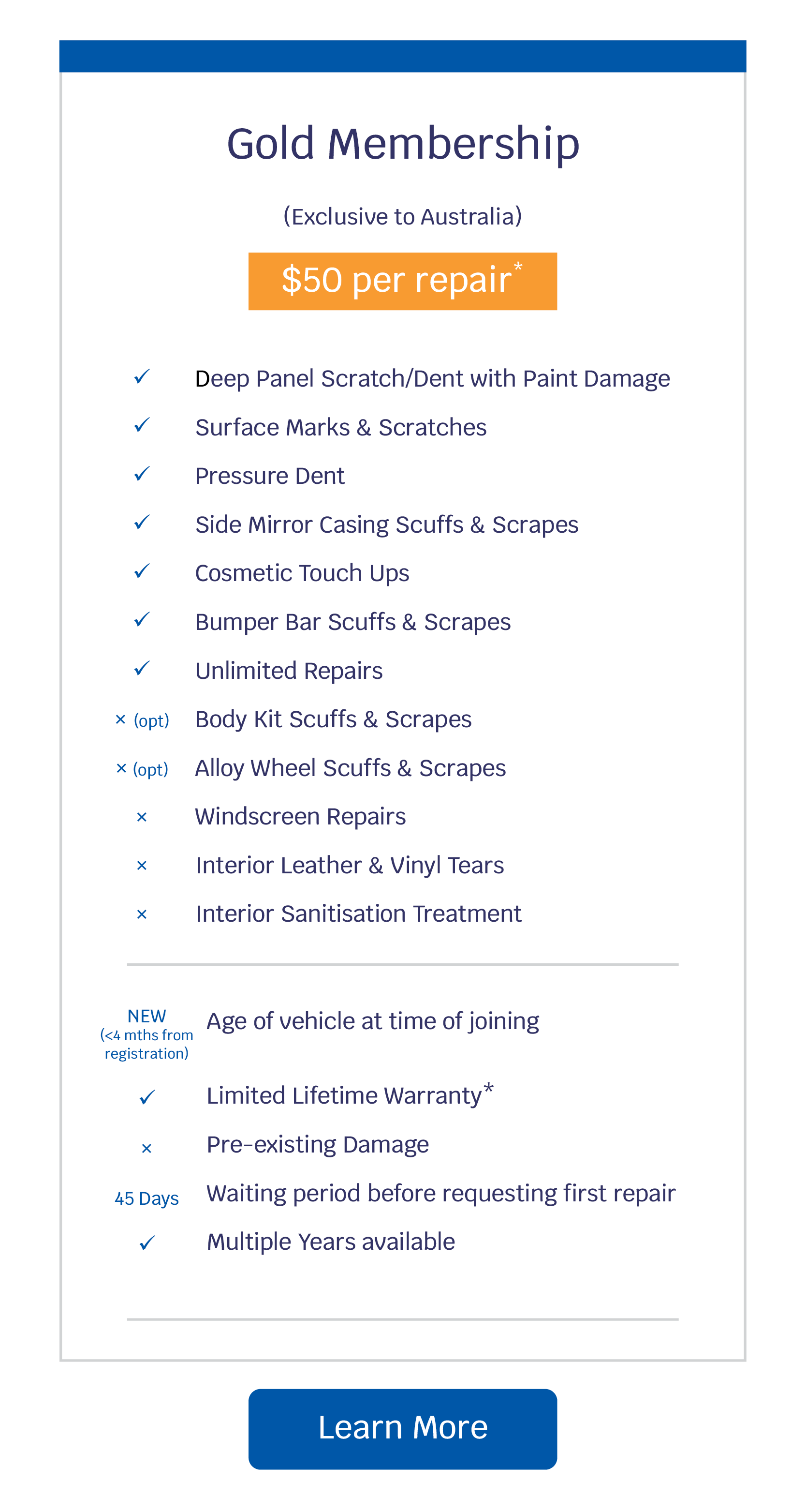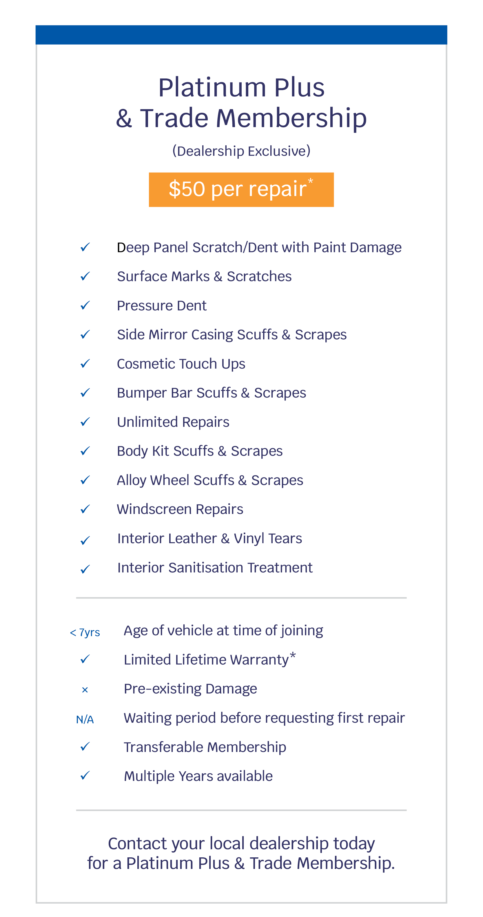 dents and scuffs, caused by everyday travels, can now be repaired from just $50 per repair with a Platinum Plus Membership*.